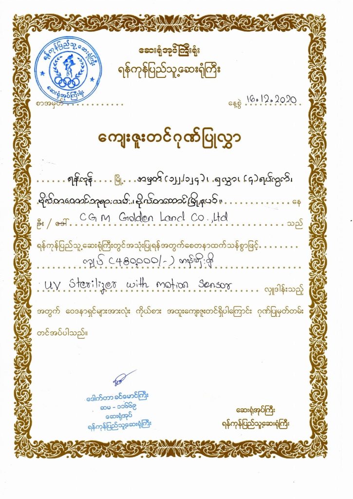 During the COVID-19 pandemic, our CGM team donated a UV sterilizer with a motor sensor to Yangon General Hospital. This contribution was made to support the hospital’s safety efforts and to help protect medical staff and patients during such a critical time.